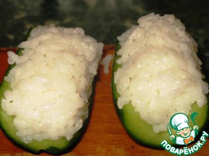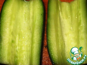 Огурец разрезать вдоль пополам и вычистить сердцевину.