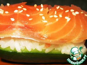 Нарезать острым ножом. Или без рыбы посыпать кунжутом и нарезать ножом.