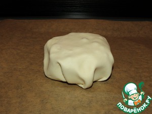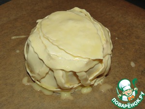 Прочно защипать края. Перевернуть сыр в тесте швом вниз и выложить на противень, застеленный пергаментом.