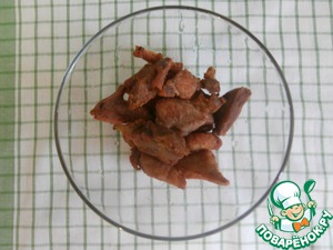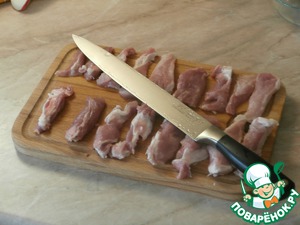 Кусок свиной мякоти, который я тщательно промываю в холодной воде, промокаю от лишней влаги салфеткой и нарезаю брусочками.
