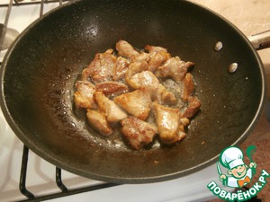 Обжариваю мясо до румяной корочки 10 минут, после чего, если вдруг мясо остаётся жёстковатым, вливаю 1/3 стакана горячей воды и припускаю мясо до готовности. Но сегодня мясо получилось великолепно - ароматное и хрустящее.