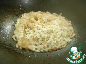 Чеснок мелко крошу ножом и смешиваю с пассированным луком,