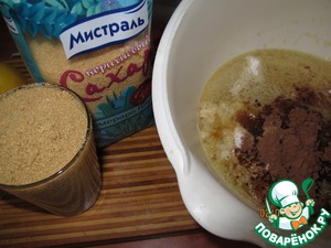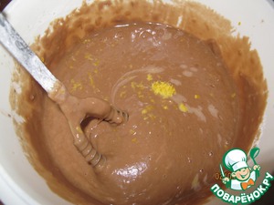 Добавить разрыхлитель, какао, воду, сахар и цедру.