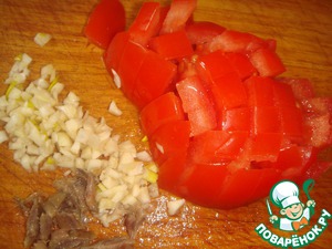 Половинку помидора режем кубиками, мелко рубим чеснок и анчоусы