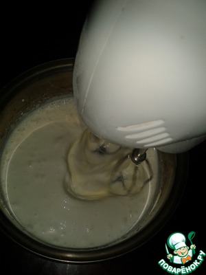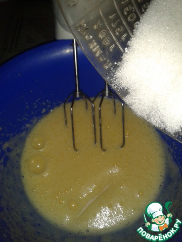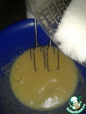 • Высыпать в яйца сахар с сбивать на максимальной скорости 15-20 мин (я ставлю миксер сбивать а за это время готовлю все остальное).