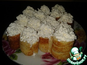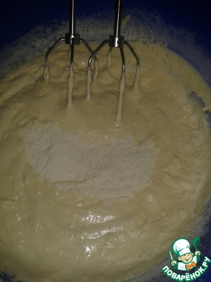 • В сбитые яйца (а они сбивались 15-20 мин) добавить сначала разрыхлитель (погашенный) и сразу за ним не мешая всыпать муку. Легонько и быстро перемешать миксером на минимальной скорости, но не сбивать!, просто чтобы размешать муку.
