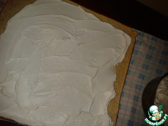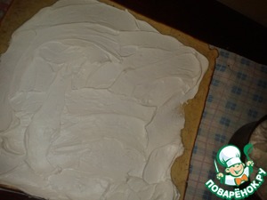 • Йогурт смешать со сливками и переложить готовый остывший бисквит на полотенце.