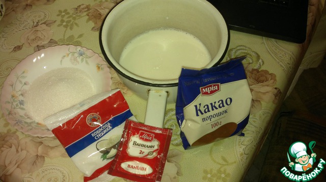 Приготовим наши ингридиенты )))зоо мл молока поставить на огонь, добавить 6 ст. ложек сахара (для тех кто любит послаже можно 8), добавить 2 ст. ложки кокосовой стружки, ванилин (или ванильный сахар)