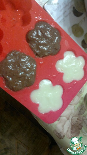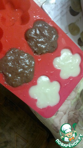 В формочки (у меня силиконовые), можно в пиалы или в глубокие тарелочки, разместить половину крема. В оставшийся крем добавить 1 ст. ложку какао и хорошо размешать
