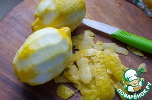 После того как отвар сварился, процедить. (Крупу не выбрасываю, я поэтому цедру режу ножом, чтобы легче перебрать от крупы, добавляю воду и варю до готовности, получается гарнир из крупы с ароматом лимона.)