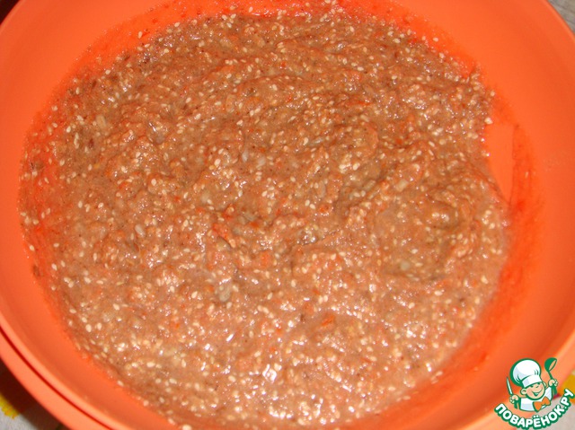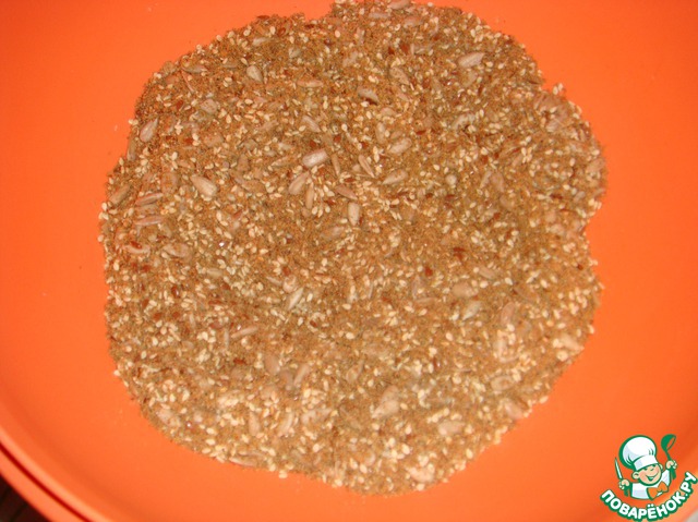 • В миске смешать молотые семена льна, кунжут, семечки подсолнуха,10 г. немолотых семян льна и 1 ст. л. затара.