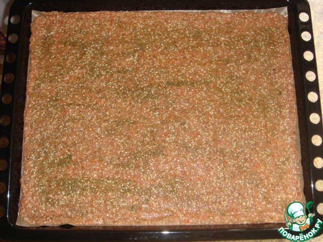 • Размазать получившееся тесто на бумаге для выпечки, выложенной на противень, размером 40 х 30 см.
