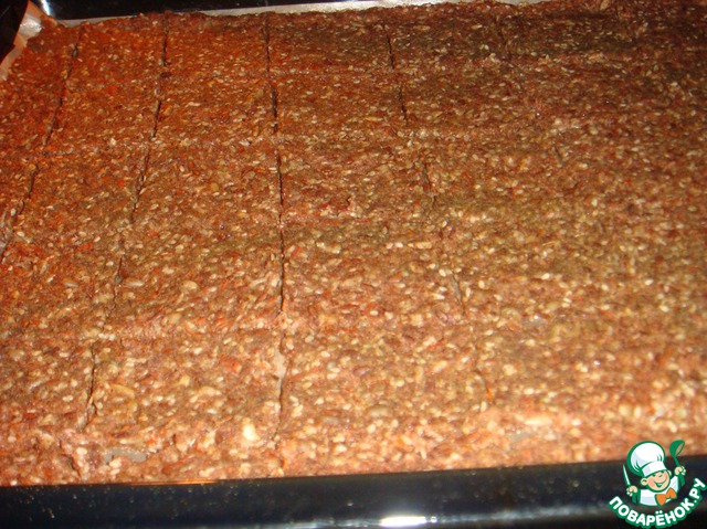 • Сушить при 40 градусах примерно 24-27 часов (или при самой минимальной температуре духовки). Примерно через 8 часов после начала сушки нарезать массу на квадратики.