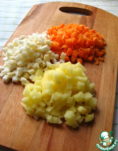 Выложить в суп и варить всё вместе ещё минут 10-15. За 2-3 минуты до конца варки суп посолить и поперчить по вкусу.