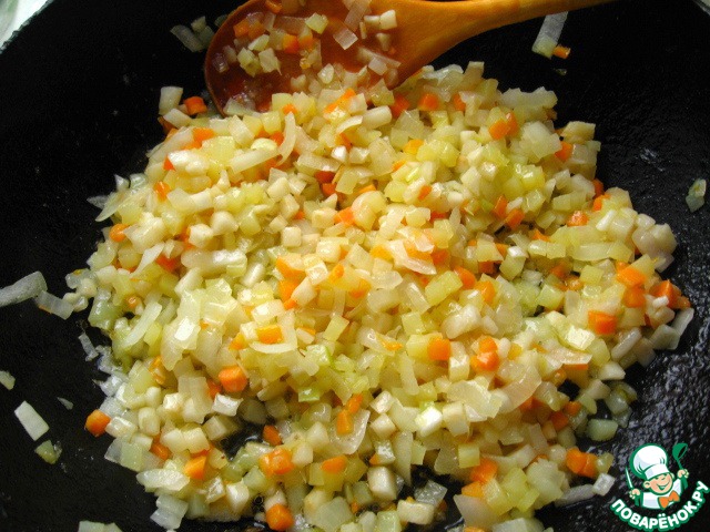 В сковороду налить оливковое масло, разогреть и обжарить в нем овощи минут 5.