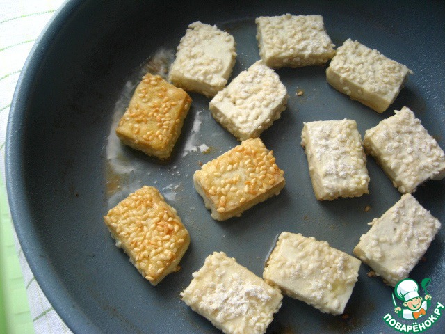 Оливковое масло разогреть на сковороде. Обжарить в нем кусочки тофу со всех сторон.