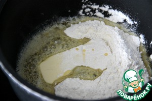 Нагреть сотейник с антипригарным покрытием, убавить огонь, выложить в него сливочное масло и когда оно ещё не до конца расстаяло, добавивь муку. Дальше очень быстро всё время мешаем деревянной лопаткой и держим на готове молоко и воду (бульон). Когда мука и масло полностью соединились и заварился небольшой комочек теста, начинаем постепенно медленными порциями подливать жидкость -