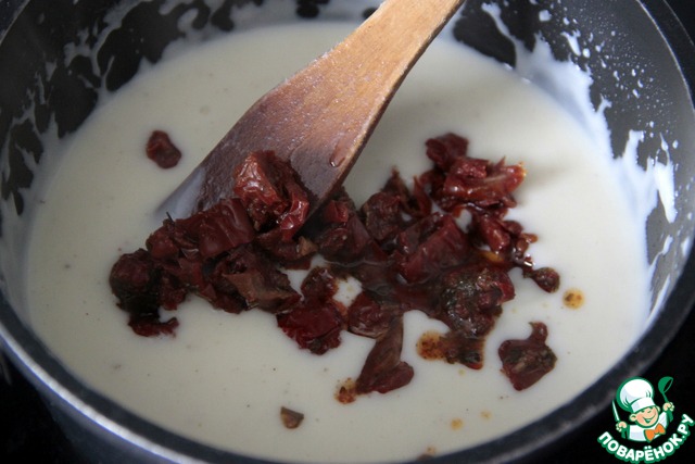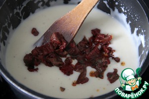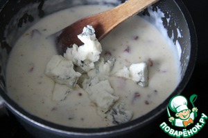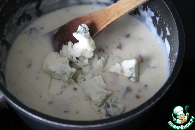 Снять с огня. Добавить в горячий соус горгонзолу, помешать, чтобы сыр растворился.