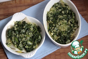 В горячей сковороде разогреть 1 ст. л. растительного масла, поджарить лук и чеснок (до прозрачности), добавить замороженный шпинат и 100 мл воды, тушить под крышкой 10 мин, периодически помешивая. Лишнюю жидкость в конце сцедить.
