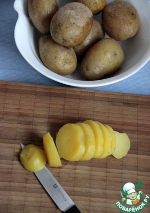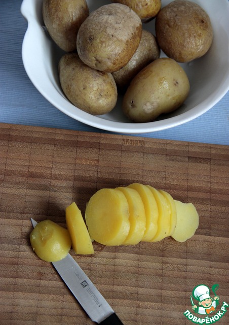 Отварить картофель в мундире в течение 20 мин., сцедить, залить холодной водой, чтобы потом легче было чистить. Дать картофелю остыть. Очистить и нарезать кружочками.