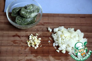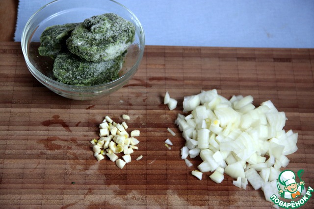 Мелко нарезеть лук и чеснок. Подготовить шпинат (свежий - промыть и встряхнуть от влаги, у меня - замороженный)