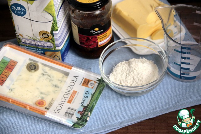 Для соуса подготовить муку, масло, молоко, горгонзоллу (другой сыр с голубой плесенью), вяленые томаты ( у меня - готовые, в базиликово-чесночном масле. Если у вас вяленые томаты без масла, то их нужно предварительно залить водой и потом отжать, нарезать)