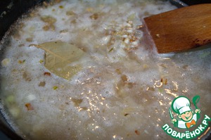 Залить горячей водой или овощным бульоном. Посолить, добавить лавровый лист.