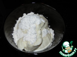 Творог взбить, постепенно добавляя сахарную пудру и сливки.
