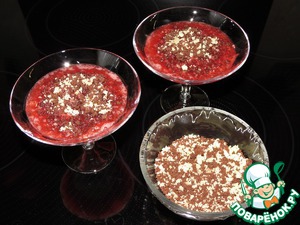 Выложить в креманки слоями ягодное пюре, бисквитную крошку или молотое печенье и творожный крем.