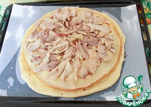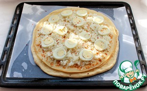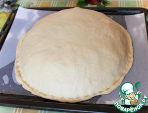 Раскатываем дрожжевое тесто в пласт толщиной 4-5 мм в круглую лепешки, укладываем в на протвинь застеленный промасленной бумагой.
