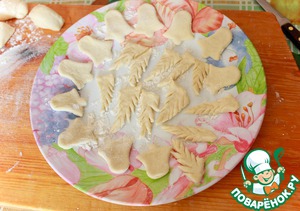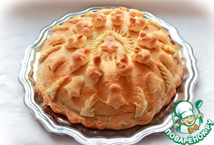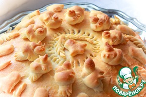 Весь курник украшаем фигурками из теста. Фигурки вырезаем из того же теста, формочками и ножом и что-то формируем вручную. и приклеиваем на молоко на курник.