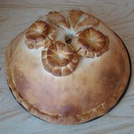 Край нижней лепешки смазываем яйцом и накрываем всю горку второй лепешкой и фигурно защипываем внизу -