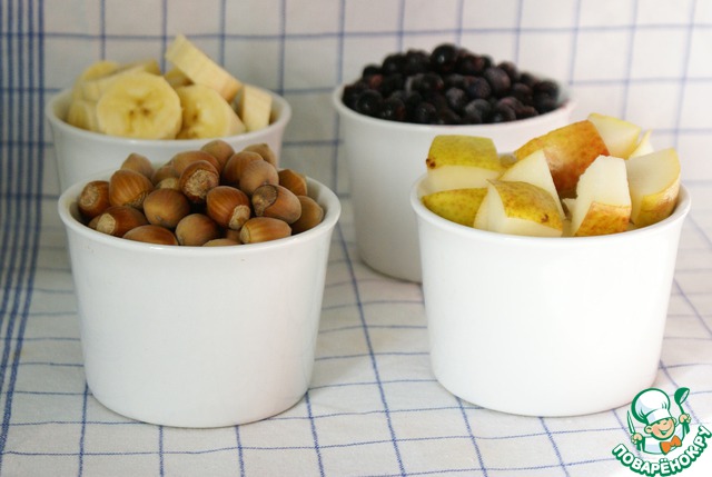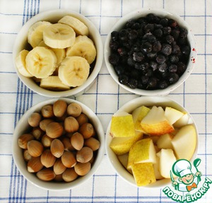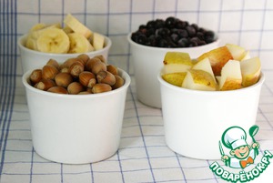 Нарезаем небольшими кусочками фрукты, орехи измельчаем, ягоды размораживаем. -
