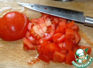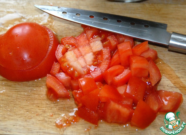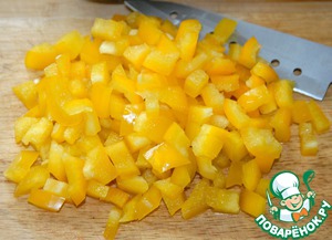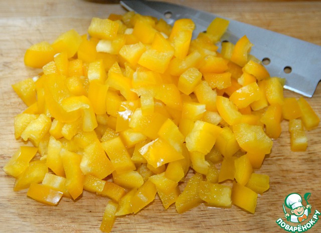 • Перец моем, очищаем от семян и также нарезаем. Салат промываем и рвем руками (сюда лучше подойдет салат айсберг, но в ближайших магазинах это редкость, к сожалению).