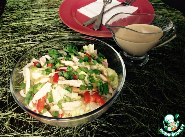 Капусту нашинковать широкой лапшой, присоединить к остальныи ингредиентам. Легко и аккуратно перемешать салат. Все продукты для заправки положить в небольшую баночку, закрыть крышкой и хорошенько протрясти.