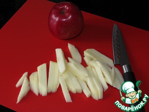 Яблоко очистить от кожуры, нарезать тонкой соломкой, замариновать в лимонном соке на полчаса.