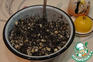 Мак залить кипятком на несколько минут, затем воду слить и добавить 150 г сахара, перемешать.