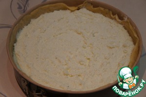Форму большого диаметра с высокими бортиками застелить пекарской бумагой и смазать маслом. Тесто раскатать в большой круг выложить в форму, оформив бортики до верха формы.