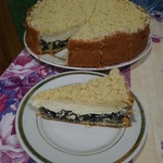 [+4]Мак я брала сразу меленный, заливала его 0.5л молока и проварила на медленном огне 30мин.(не отцеживала!) Когда он немного остыл додала порезанные яблоки+сахар+30г масла+ 100г сухой манной крупы+ ложечка ванили+1 яйцо. Всё перемешала и оставила эту смесь на 30мин для набухания манки. 50г манной крупы+100г кефира - перемешала и оставила манку набухать. В миксер положила творог+1 яйцо+3ст ложки с верхом сахар+ваниль+набухшая в кефире манка+30гразмягчённого сливочного масла - всё перебила до однородной гладкой массы. Тесто делала строго по вашему рецепту, но у меня силиконовая круглая форма и я никогда уже давно не делаю ни в одном своём изделии никаких бортиков. Начинка ведь после остывания всегда держит форму. Я тесто равномерно руками распределила по дну формы (без бортиков!). Форму с тестом поставила в глубокий противень.