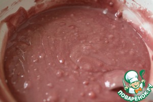 Добавляем воду, масло, вишневый сок и эссенцию, хорошенько перемешиваем, чтобы большая часть сахара растворилась.