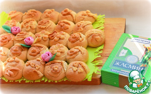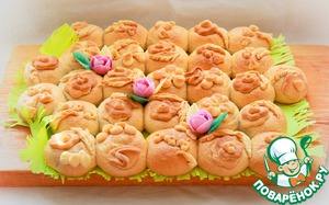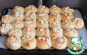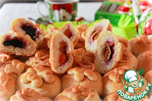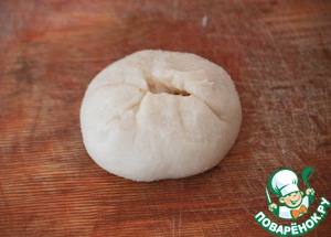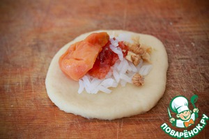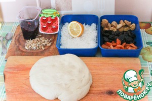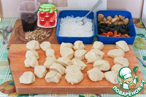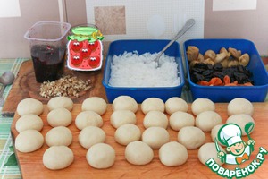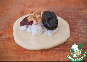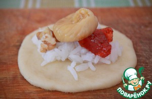 Каждый колобок раскатываете как на пирожок и кладёте начинку в произвольном порядке, ложечку риса, немного орешков, пол. ложечки конфитюра, сухофрукт. -