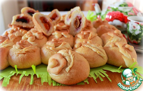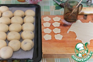 Шарики с начинкой укладываем на подготовленный продвинь в произвольном порядке, но не очень плотно, даём пирогу расстояться минут 15, сами тем временем вырезаем украшения из оставленного теста.