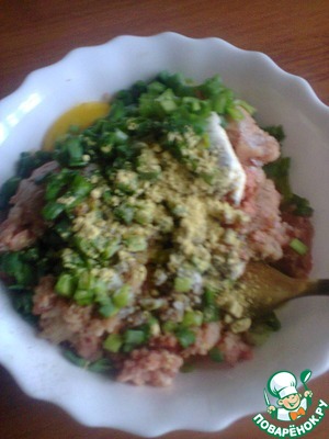 Тем временем, обрезанное мясо и ветчину (можно заменить беконом, охотничьими колбасками. В общем всем тем, что имеет вкус копченостей) пропускаем через мясорубку (ветчину, в принципе, можно порезать маленькими кубиками. Так даже интересней будет). Добавляем соль, перец, сливки, зелень и белок взбитый. Тщательно все перемешиваем.