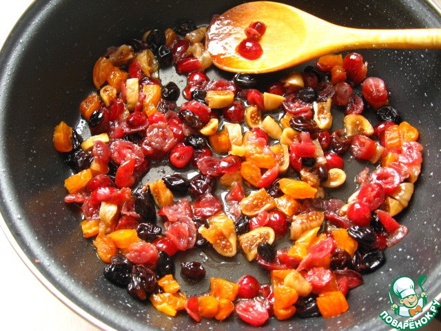 - Сухофрукты (смесь (изюм, курага, чернослив, вяленая клюква, финики, инжир)) — 1.5 стак.