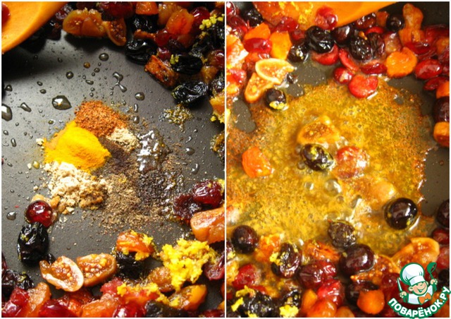 Сухофрукты в сковороде сдвинуть в сторону, освободив середину сковороды. Выложить специи и цедру лимона в середину сковороды в горяее масло, чтобы они прогрелись. Перемешать.