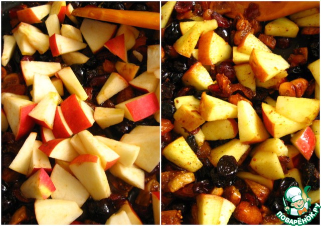 В сковороде с толстым дном (или кастрюле) разогреть подсолнечное масло. Выложить в него сухофрукты и обжарить их в течение 5 мин., постоянно помешивая.