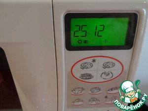Отправляем в духовку. У меня микроволновая печь с функциями духового шкафа и разными режимами. Я выбрала режим курица, т. к. это конвекция и жар сверху, жар снизу. Режим автоматически выдает 25 минут, но я ставила на минут 12.