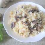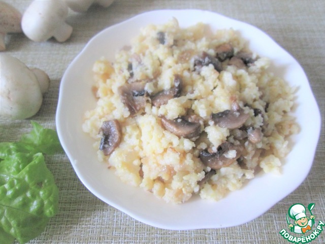 В это время на сковороде слегка припустить мелко порезанный лук, добавить порезанные грибы (я брала Шампиньоны, но это не принципиально), посолить и обжаривать еще минут 10, пока немного не выпарится сок от грибов.