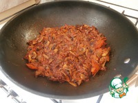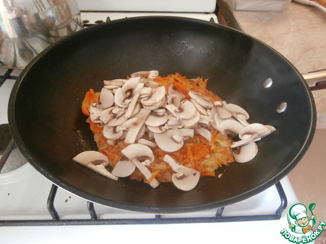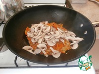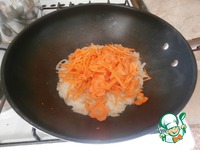 Добавляю морковь, нарезанную соломкой и "цветочками", обжариваю, пока на моркови не появится лёгкая поджаристая корочка |