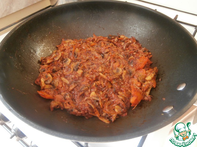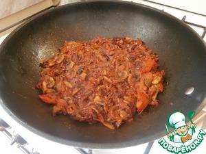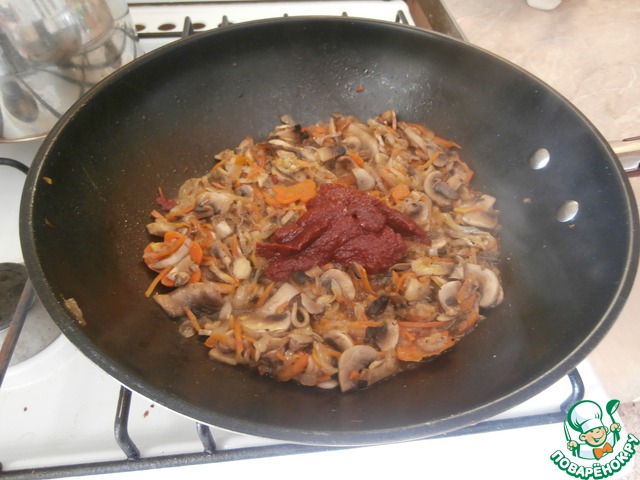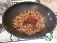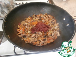 Как только шампиньоны дают сок, добавляю томатную пасту. |
